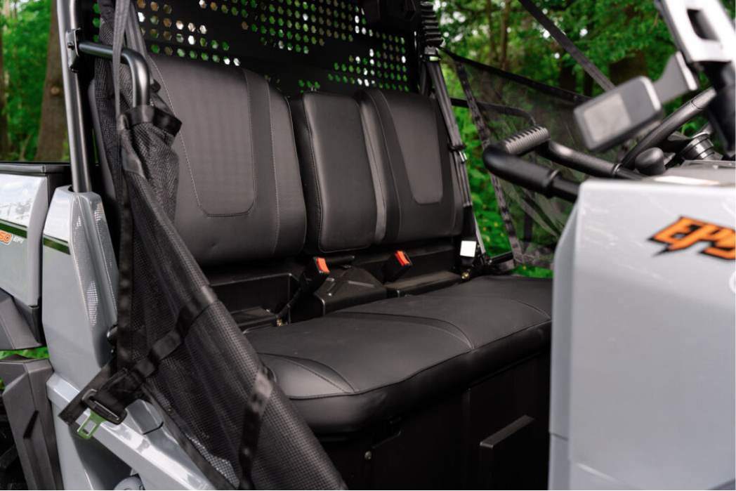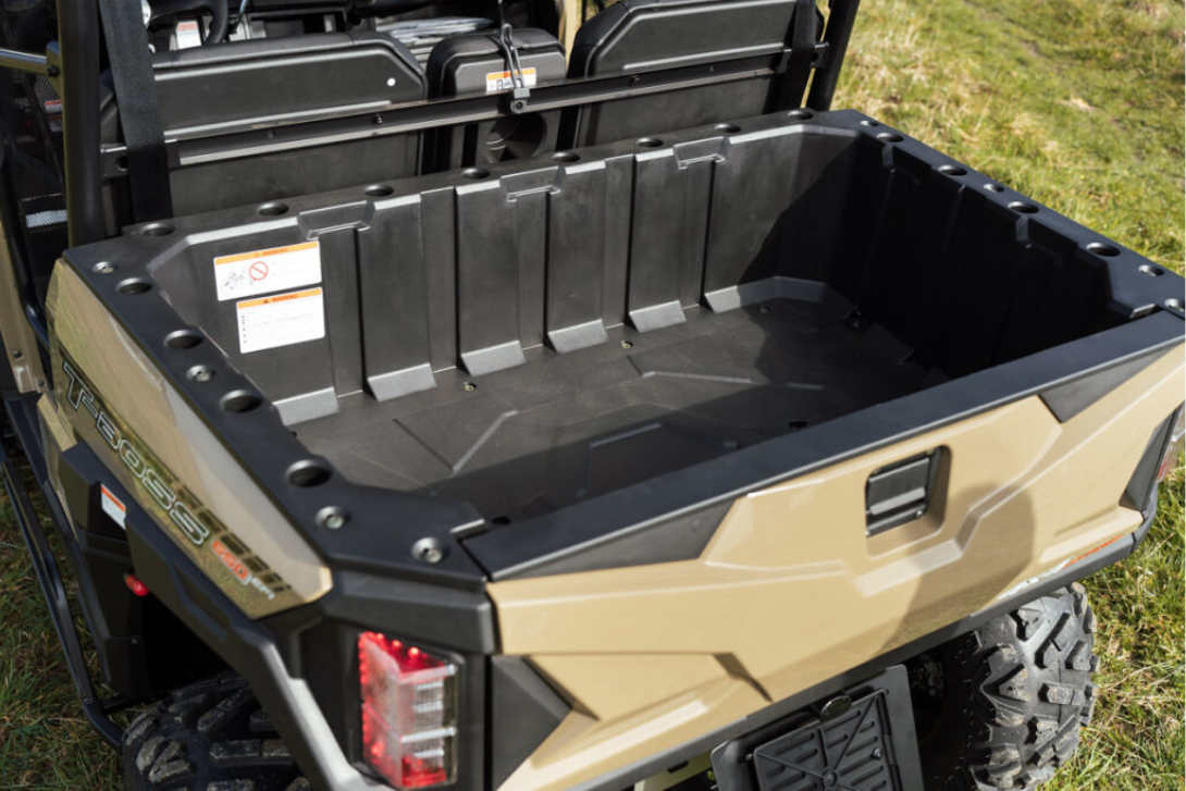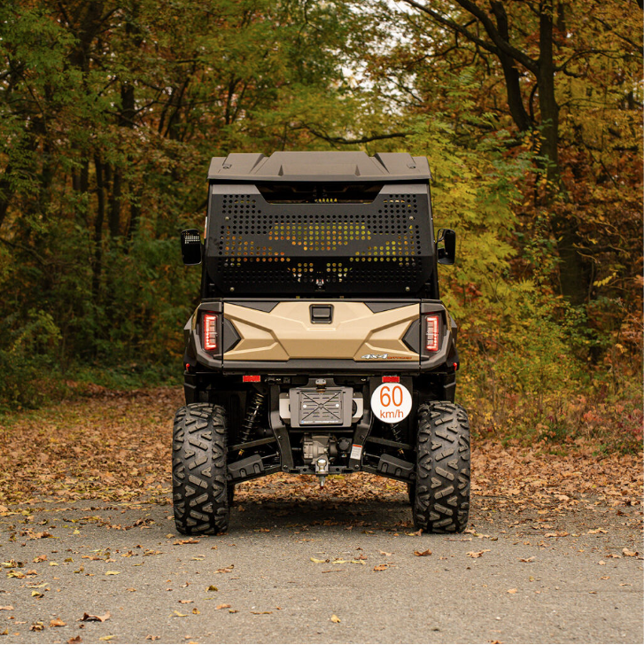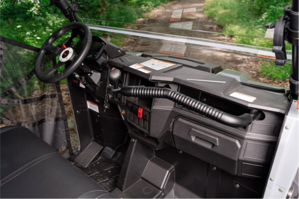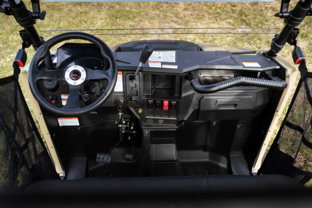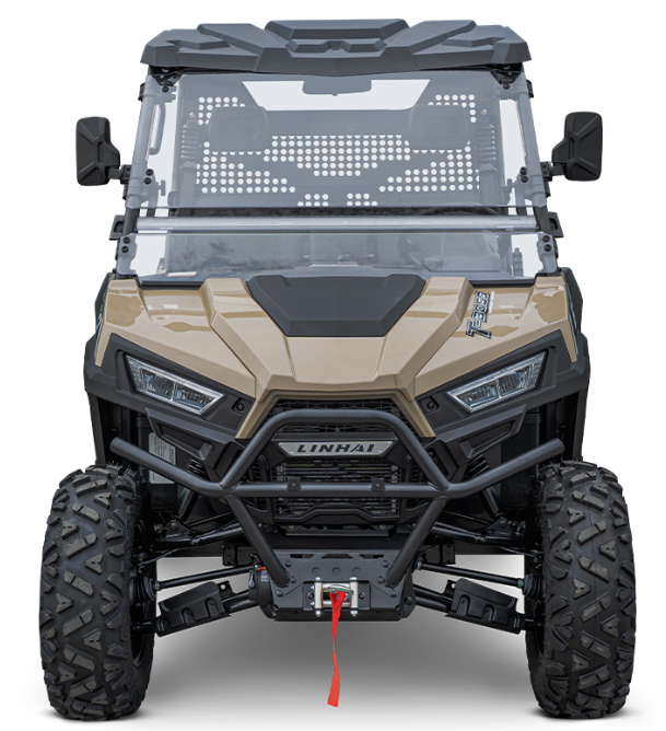 Električni servo upravljač, fiksni plastični krov, prednji dio od punog pleksiglasa, prednji zaštitni okvir, sigurnosne mreže na strani vozača i suvozača, ručke za suvozača, čelični kip tovarni prostor, nasloni za glavu, kuka za vuču, električno vitlo na daljinsko upravljanje
